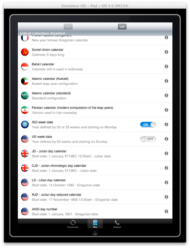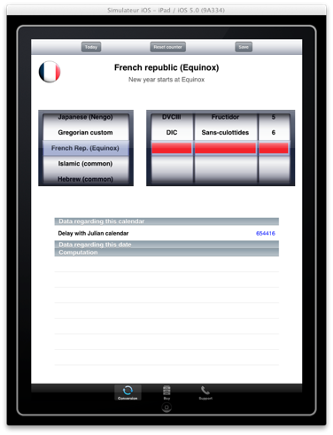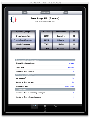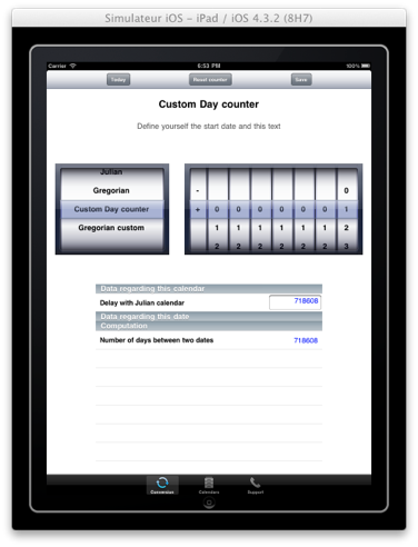 | Se puede descargar el calendario estandar y personalizarlo con una fecha de inicio particular. De esta manera es posible obtener un calendario empezando el día de una fecha de nacimiento, por ejemplo. En este momento dos calendarios son disponibles : - Gregoriano - El contador de días Se puede definir un contador de días con la fecha de nacimiento de referencia en trés etapas siguientes : Etapa 1: Seleccionar la fecha del 1 enero 1 en el calendario Juliano. Después, reinicializar el contador de días. Este nombre debe indicar 0. Etapa 2: Seleccionar una fecha de nacimiento en el calendario Gregoriano o un otro calendario. Es necesario de conservar el nombre indicado el la pantalla. Este es el nombre de los días entre el 1 de enero 1 del calendario Juliano et la fecha seleccionada. Etapa 3: Copiar el nombre memorizado en la pantalla dedicada del calendario personalizado. Etapa 4: También se puede modificar el título, así como las informaciones del nuevo calendario. |   |